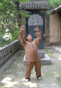 Meister Shen Xijing übt Daoyin Gong (Dehnen und leiten des Qi) im Kloster der Jadequelle (Tianhshui, VR China)